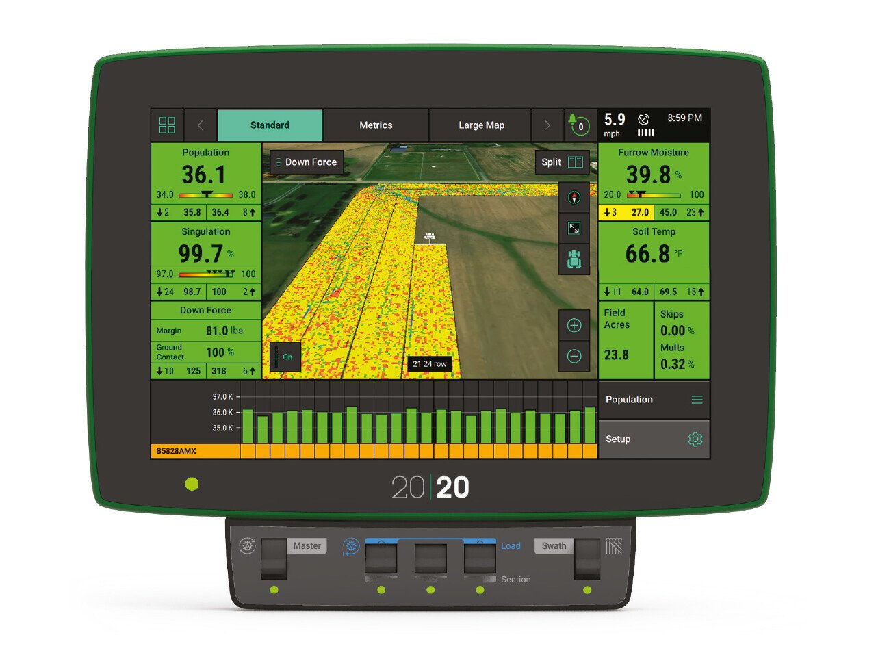 DeltaForce - обеспечивает независимое регулируемое прижимного усилия каждой отдельной высевающей секции на основе данных сенсоров, измеряющих нужную силу. На мягком грунте уменьшает усилия на высевную секцию, передавая ее на раму сеялки. Проверьте силу прижатия на мониторе 20/20 SeedSense®.