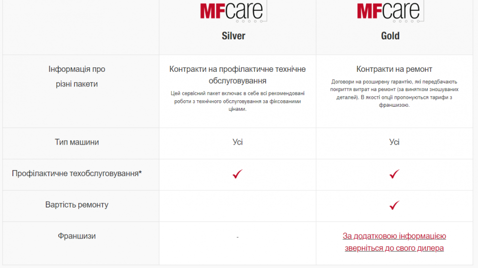 MF Care Gold - договори на розширену гарантію, які передбачають покриття витрат на ремонт (за винятком зношуваних деталей).